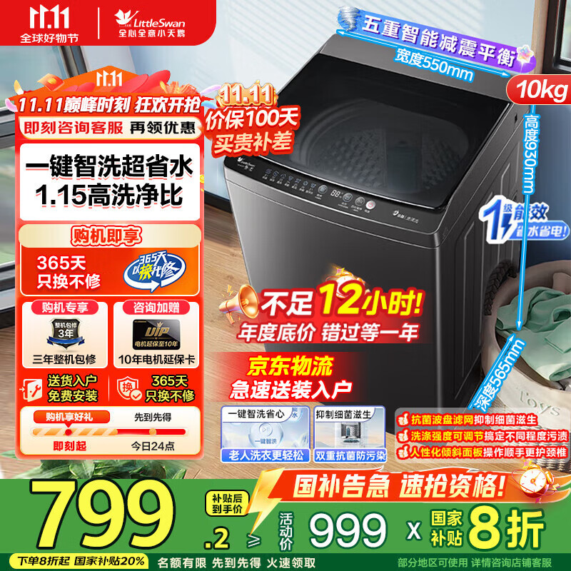 包邮 小天鹅(LittleSwan)波轮洗衣机天瀑泡泡净全自动大容量 一级能效智能节能省电水电双宽 智能预约一键智洗租房家用电器 店长推荐|新款泡泡净|一级能效双重抗菌10V27T